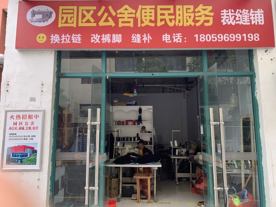 園區(qū)公舍便民服務(wù)裁縫鋪位于東吳尚城一層外圍沿街商鋪西首,經(jīng)營范圍:縫補(bǔ)衣物、修扁褲腳、更換拉鏈等修補(bǔ)衣物業(yè)務(wù)。